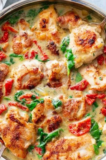 This creamy Tuscan chicken is a super-tasty one-skillet meal that’s perfect for weeknights and full of flavor! Boneless, skinless chicken thighs are seared and cooked with a creamy sauce packed with spinach and sun-dried tomatoes