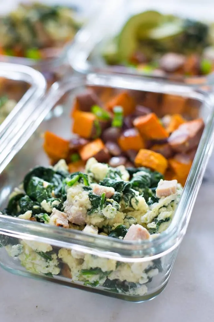 - On the other side of the meal prep containers divide our egg white scramble into even portions.